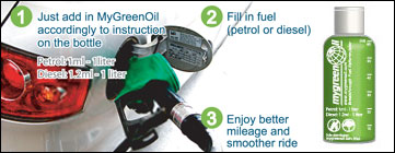 | MyGreenOil is a multi-functional fuel reformulator. When mixed with any liquid fuel, it immediately changes normal fuel, making it a super efficient fuel which performs at optimum value, resulting in multiple benefits to the consumers. |